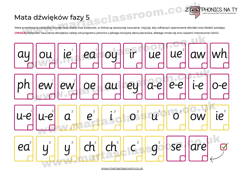 - Zestaw nr 3 (dźwięki fazy 5) – kolejny etap nauki phonics realizowany w klasie Year 1 w Anglii (dla dzieci od 5–6+).Wprowadza nowe dźwięki oraz alternatywne zapisy znanych już fonemów.